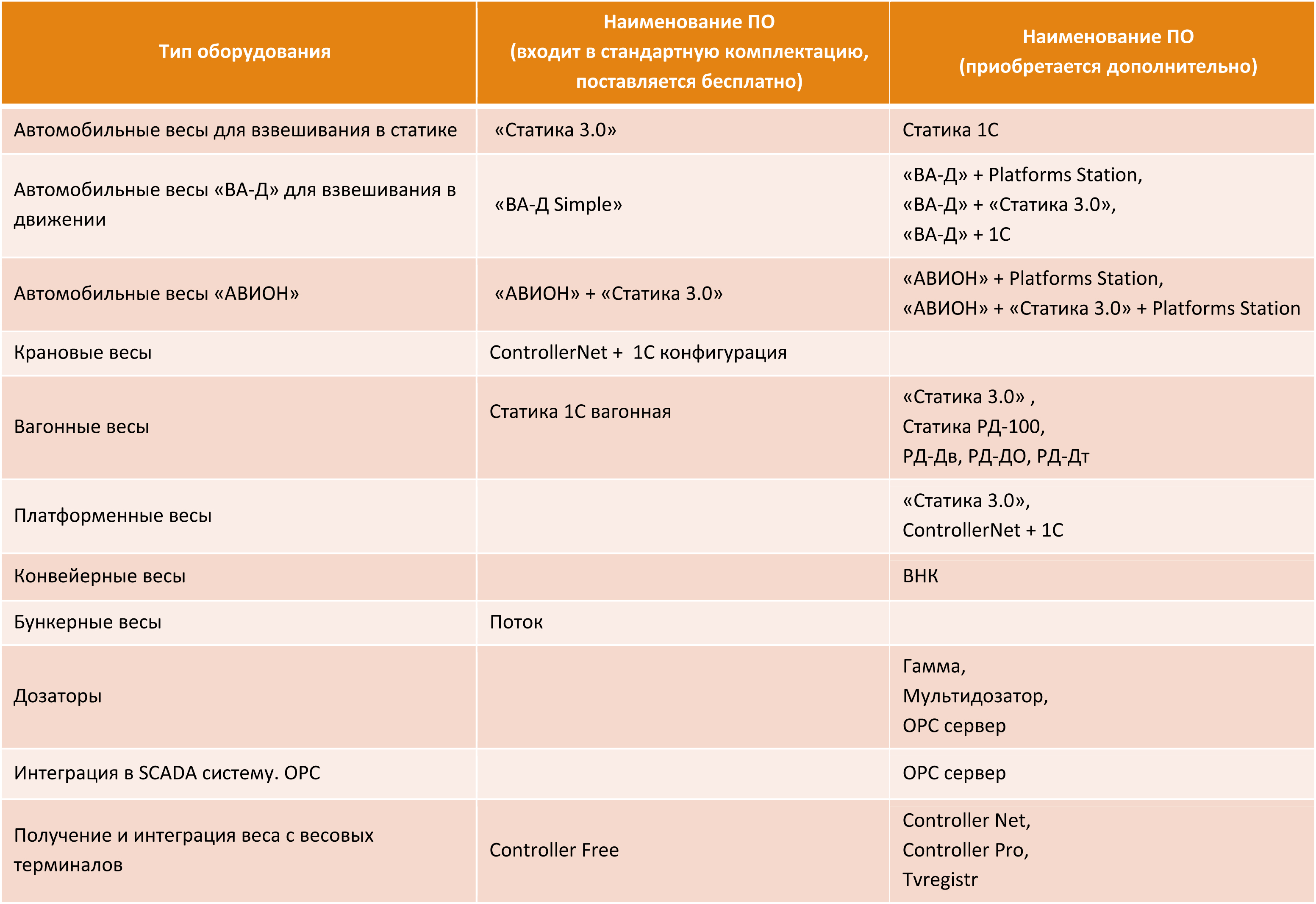 Этот «путеводитель» помещается на одном листе бумаги и представляет собой прозрачную и простую для понимания схему, систематизирующую разработанные профессиональной командой программистов продукты. Все актуальные на сегодня версии ПО и группы весов, дозаторов и терминалов умещаются всего в 33 клетках таблицы. Например, автомобильные весы «АВИОН» в стандартной конфигурации комплектуются программным пакетом, состоящим из модуля взвешивания «АВИОН» и учетного модуля «Статика 3». Дополнить этот пакет можно продуктом PlatformsStation для оценки ущерба, наносимого транспортным средством.